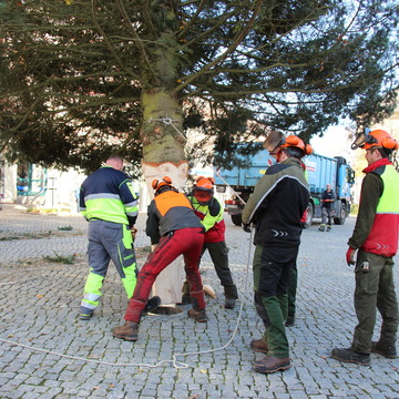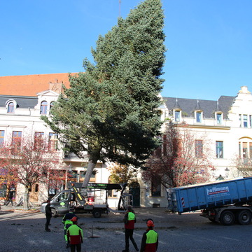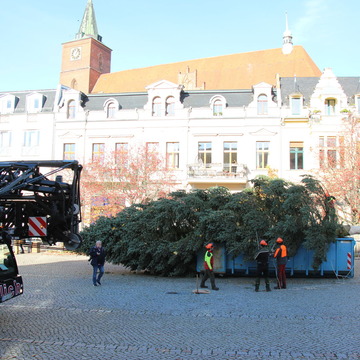 Ein prächtiger Baum markiert seit Mittwoch, dem 5. November, den Mittelpunkt des Marktplatzes. Mitarbeiter des städtischen Forstes hatten die Colorado-Tanne um die Mittagszeit vor dem Historischen Rathaus aufgestellt.