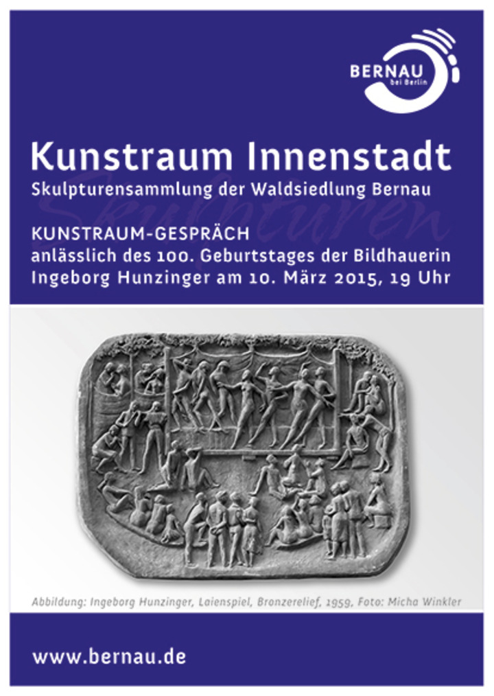 Um „Ingeborg Hunzinger – Kommunistin und Künstlerin“ geht es im Kunstraum-Gespräch am kommenden Dienstag, den 10. März, 19 Uhr. Das Kulturamt der Stadt lädt dazu in die Ausstellungsräume Alte Goethestraße 3 (an der Stadtmauer) ein. Zu sehen ist dort die Skulpturensammlung der Waldsiedlung Bernau. Ingeborg Hunzinger ist in der Ausstellung mit dem Bronzerelief „Laienspiel“ (1959) vertreten. Ein weiteres Relief von ihr – „Am Strand“ (1960), Terrakotta – ist noch in der Waldsiedlung, auf dem Gelände der Brandenburg-Klinik zu finden. Anlass für den Gesprächsabend als Fortführung der Kunstraum-Gespräche ist der 100. Geburtstag der Bildhauerin. Über sie und ihr Werk sprechen der Publizist Dr. Thomas Flierl und der Kunstwissenschaftler Dr. Jens Semrau.