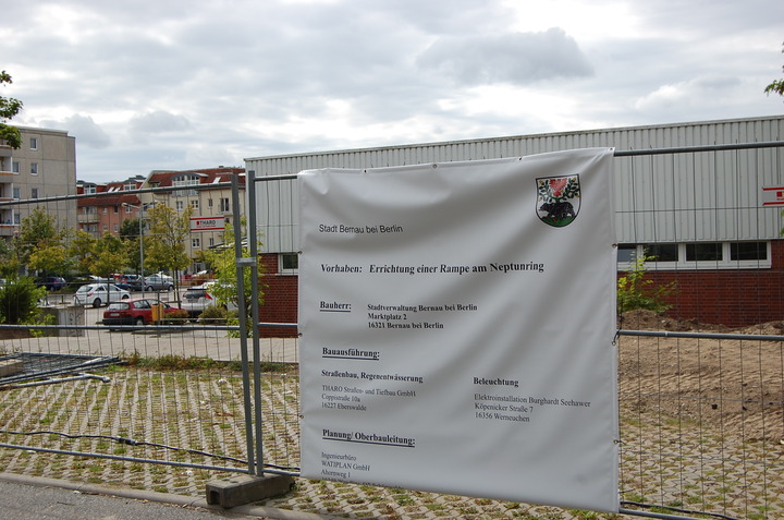 Mit dem Bau einer Rampe wird am kommenden Donnerstag (4. August) am Neptunring in Bernau-Süd begonnen. „Die behindertengerechte Rampe wird den Neptunring mit dem etwa 1,50 Meter tiefer liegenden Parkplatz verbinden“, informiert Kirstin Plokarz vom Bauamt.