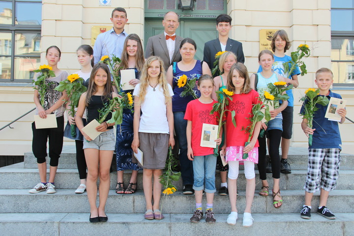 Vor dem Start in die Sommerferien und bei hochsommerlichen Temperaturen kamen am Mittwoch Bernauer Schülerinnen und Schüler zu einem besonderen Termin ins Rathaus. Seit vielen Jahren zeichnet der Bürgermeister am letzten Schultag junge Menschen für besondere schulische oder außerschulische Leistungen aus. In diesem Jahr gehörten 14 Fünft- bis Zehntklässler zu den Geehrten. „Nicht nur gute Noten, sondern auch wesentliche Leistungssteigerungen, Übernahme sozialer Verantwortung in der Schule und außerschulisches Engagement ist für uns ausschlaggebend“, erklärte Hubert Handke am Mittwoch im Rathaus. Vorgeschlagen von ihren Schulen, die sich in städtischer Trägerschaft befinden, erhielten die Ausgezeichneten nur lobende Worte. Ob respektiert als Klassensprecherin oder erfolgreich beim Vorlesewettbewerb, ob beim Sportfest aktiv oder als selbstloser Lernpartner engagiert – immer wieder treten zu den guten Lernleistungen Engagement, Hilfsbereitschaft oder ein ausgleichendes und integratives Wesen.