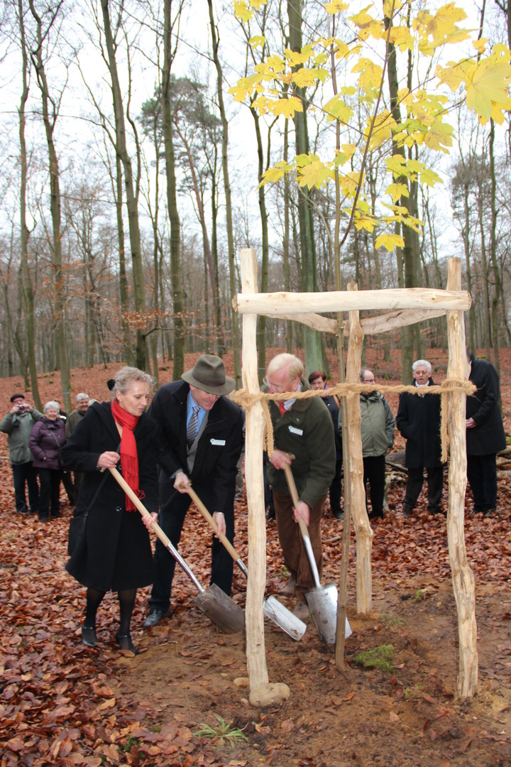 Im Anschluss an die Eröffnungsfeier, die mit dem Pflanzen eines Ahornbaumes abgerundet wurde, hatten die Gäste Gelegenheit, den neuen Friedwald unter fachlicher Führung kennenzulernen. Friedwald-Regionalbetreuer und Förster Martin Böger informierte bei einer Waldführung ausführlich über das Konzept der Bestattung in der Natur. So erfuhren die Gäste Wissenswertes über Baumgrabarten, Preise und Gestaltungsmöglichkeiten einer Beisetzung im Wald. 300 Bäume wurden zunächst als Bestattungsbäume ausgewählt, bis zu 10 Urnen können pro Baum beigesetzt werden. Försterin Irka Mohr und ihr Kollege Jacob Oehlenberg organisieren regelmäßige Führungen, helfen bei der Baumauswahl und begleiten Beisetzungen.