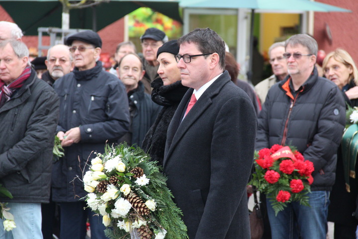 Der Opfer des nationalsozialistischen Rassenwahns und Völkermordes gedachten heute etwa 100 Bernauerinnen und Bernauer am Ehrenmal vor dem Bahnhof. Zur Kranzniederlegungen aufgerufen hatte Bürgermeister André Stahl.