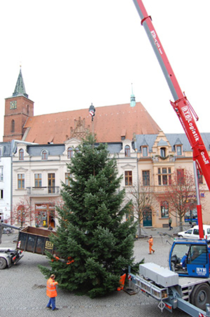 Mithilfe eines großen Kranes wurde die Tanne auf dem Marktplatz aufgestellt