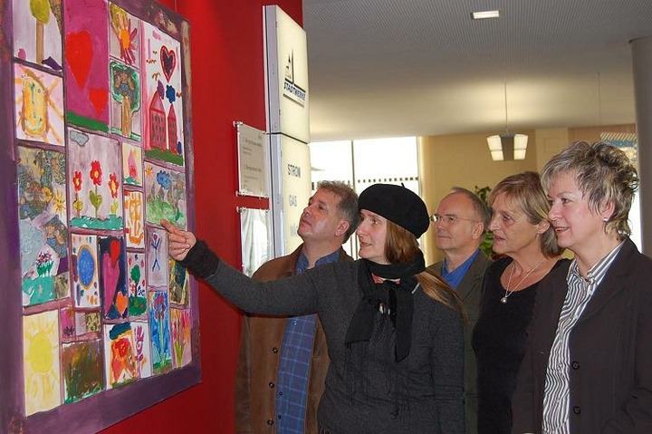 Die Künstlerin Annett Schauß erklärt Bärbel Köhler, Geschäftsführerin der Bernauer Stadtwerke, die Entstehungsgeschichte des Kinderkunstwerkes. Mit dabei: Olaf Enkelmann (Internationaler Bund), Bruno Breitfeld (Agentur Ehrenamt) und Elke Keil (Lokales Bündnis für Familie) (v. l.)