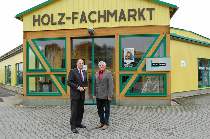 Geschäftsführer Hartmut Theile (r.) mit Bürgermeister Hubert Handke vorm Geschäftseingang der Holz-Zentrum Theile GmbH in der Schwanebecker Chaussee.