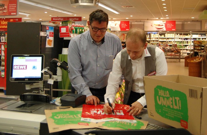Die ersten Tüten aus Polyäthylen gab es Anfang der 1960er Jahre an den Kassen der Geschäfte. Jetzt hat REWE als erster großer Lebensmittelhändler in Deutschland entschieden, flächendeckend auf den Verkauf von Plastiktüten zu verzichten und stattdessen auf die Mehrfachverwendung von alternativen Tragetaschen und Einkaufskartons zu setzen. Ziel ist die Reduzierung von Plastikmüll. Unterstützt wird das Unternehmen durch den Naturschutzbund (Nabu).