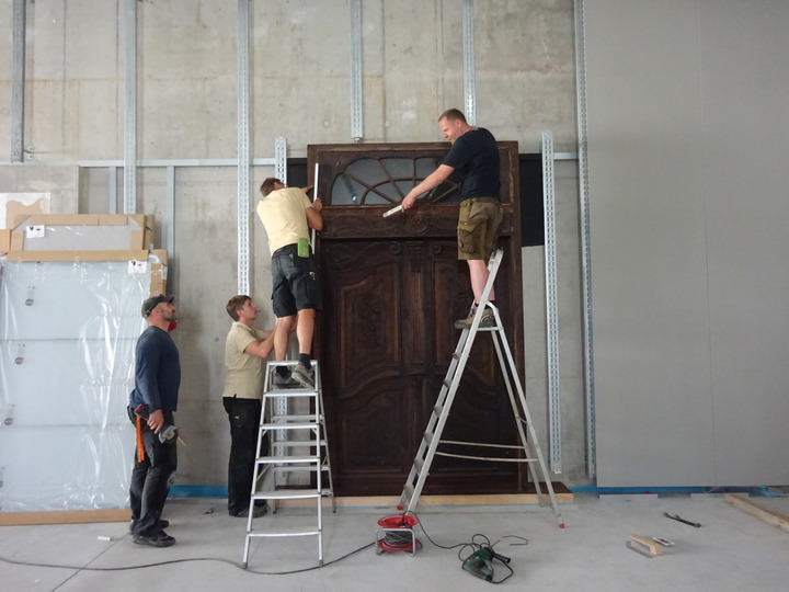 Den Transport von der Kirche ins Rathaus übernahmen Mitarbeiter der Bernauer Tischlerei Schade. Dazu mussten sie die zentnerschwere Tür aus Eichenholz in ihre Einzelteile zerlegen. Akribisch bauten sie dann alles wieder zusammen: die Flügel, das Oberlicht, die Zarge und die Blendrahmen. Und wie das Leben so spielt: Sebastian Schade ist der Enkelsohn des inzwischen verstorbenen Jofried Gorgs. Für ihn war es kein Tag wie jeder andere, als er mit seinen Männern die Tür einbaute. „Ich freue mich, dass die Rosentür jetzt ihren Platz im neuen Rathaus hat. Mein Opa wäre sehr glücklich darüber“, so der Tischlermeister sichtlich gerührt. Seine Firma übernimmt im Übrigen die Möblierung des neuen Gebäudes, baut dort unter anderem etwa 300 Meter Schränke ein. Und bevor das Rathaus seine Pforten öffnet wird Restaurator Alexander Gaethke die prachtvolle Holztür noch einmal einer Verjüngungskur unterziehen.