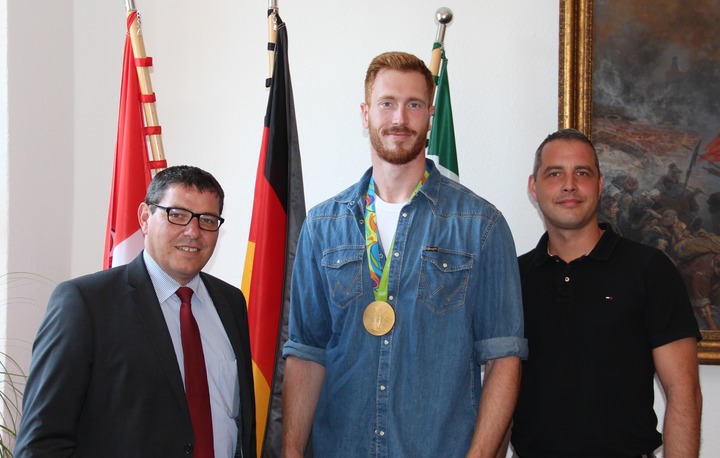 Auf eine kleine Stippvisite zum Hauptsponsor KMG Kessmann Montage Group begab sich Olympiasieger Christoph Harting nach Bernau. Bei der Gelegenheit besuchten der Diskuswerfer und sein langjähriger Förderer Michael Kessmann auch das Rathaus. Bürgermeister André Stahl begrüßte den 26-Jährigen Leistungssportler und beglückwünschte ihn zu seinem beeindruckenden Erfolg.