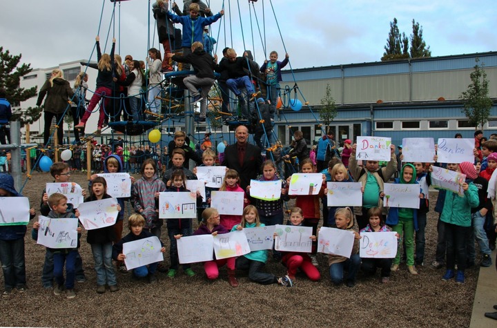 Der gesamte Schulhof hatte sich gefüllt, als Bürgermeister Hubert Handke in einer kurzen Übergaberede den beteiligten Baufirmen für die geleistete Arbeit dankte. Während das Stadtoberhaupt noch das Wort an den ausführenden Planer übergab, reihten sich die Schulklassen mit ihren Lehrern um das überdimensional große Spielgerät. Einige hielten selbstgemalte, bunte Dankesgrüße in die Höhe. Und dann war der Moment endlich da: Schulleiterin Elke Pätz gab das Kommando und hatte kaum zu Ende gesprochen, da nahmen die Mädchen und Jungs ihren Vogelnestbaum schon euphorisch in Besitz.