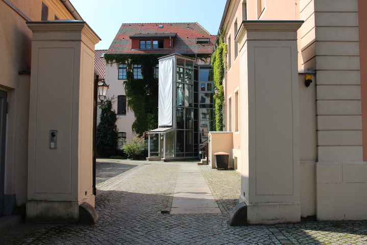 Der Hof des Rathauses ist von der Brauerstraße aus erreichbar. Etwas versteckt, hinter dem Aufzug in der Bildmitte, befindet sich die Glastüre, über die das Rathaus in den kommenden Wochen begehbar ist (Foto: Pressestelle) (Bild: 1/2)