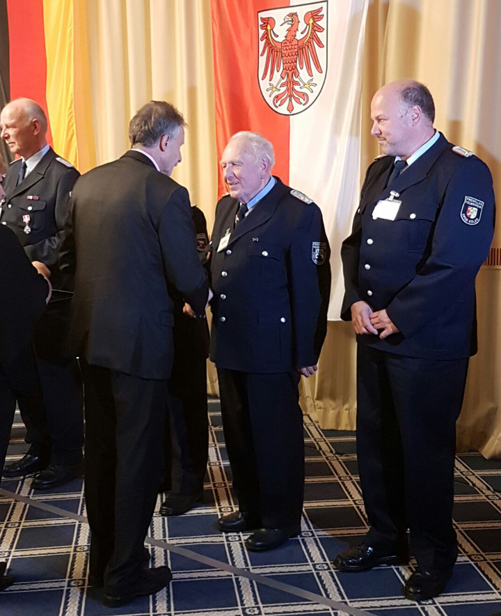 Für besondere Leistungen und hervorragende Verdienste im Brand- und Katastrophenschutz hat Innenminister Karl-Heinz Schröter 66 Brandenburgerinnen und Brandenburger ausgezeichnet. Er überreichte ihnen am 14. Oktober bei einem Empfang in Potsdam das Ehrenzeichen des Landes Brandenburg im Brand- oder Katastrophenschutz. Einer der Ausgezeichneten ist Dieter Wegener von der Bernauer Freiwilligen Feuerwehr.