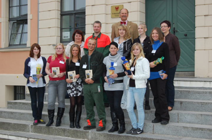 Glückwünsche zum erfolgreichen Abschluss ihrer Ausbildung bei der Stadt Bernau bei Berlin nahmen der Forstwirt Marco Sachs, die Verwaltungs-fachangestellten Melanie Jitschin, Christin Scholz und Charleen Haase sowie die Fachangestellten für Medien- und Informationsdienste Sweta Meschkapowitz und Martina Thiele von Bürgermeister Hubert Handke entgegen. Dieser konnte gleichzeitig die neuen Azubis mit einer symbolischen Schultüte begrüßen, denn auch in diesem Jahr beginnen wieder junge Leute ihre berufliche Laufbahn bei der Stadtverwaltung. So wollen Annika Blacha und Liza Krätschmann Verwaltungsfachangestellten und Juliane Müller und Nastasja Wegner Fachangestellten für Medien- und Informationsdienste werden. Zum Forstwirt bzw. zur Forstwirtin ausgebildet werden Tina-Marie Baltot und Max Myliss.Foto: Pressestelle