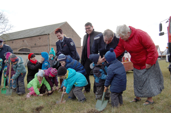 Wenn das kein gutes Omen ist: Anstelle des symbolischen einen ersten Spatenstiches gab es gestern in Schönow gleich derer viele. Die Knirpse aus der Kita „Weltenbummler“ waren mit Feuereifer bei der Sache. Zusammen mit Bürgermeister André Stahl, Ortsvorsteherin Adelheid Reimann, Stadtwehrführer Jörg Erdmann und Löschzugführerin Jacqueline Sachs sorgten sie dafür, dass der Baugrund schon einmal bewegt wird. Gekommen zu dem Termin waren auch viele Kameradinnen und Kameraden des Löschzugs Schönow sowie Stadtverordnete. Sie alle freuten sich über den Baustart.