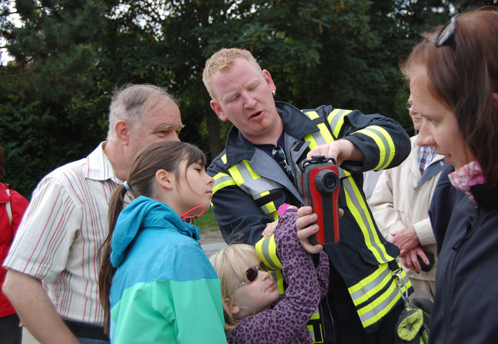 Einmal mehr hat sich gezeigt: Selbst im Smartphone-Zeitalter übt die Feuerwehr eine Faszination auf Kinder aus. Gebannt schauten die Mädchen und Jungen, die zusammen mit ihren Großeltern oder Eltern zum Gerätehaus am Angergang gekommen waren, auf die Vorführungen der Feuerwehrleute. Völlig baff waren sie, als die Kameraden demonstrierten, welch riesige Stichflamme entsteht, wenn in einer Pfanne brennendes Öl mit Wasser gelöscht wird. Längst nicht alle wussten, dass in einem solchen Fall das Feuer erstickt werden muss. Schnell gehört also ein Deckel auf die Pfanne oder den Topf.