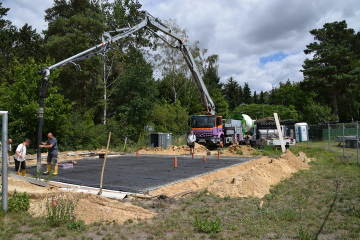 Gestern in den frühen Morgenstunden transportierte ein Fahrmischer den Frischbeton zur Baugrube des Gemeinschaftshauses Birkholzaue. Nachdem bereits Ende Mai die Vorbereitungen für die Bodenplatte erfolgten, wurde nun der Beton in die Verschalung des Fundaments gegossen.