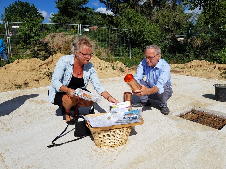 Gemeinsam vergruben sie in der Bodenplatte der Begegnungsstätte eine Zeitkapsel. Diese enthielt einen Bauplan des Gemeinschaftshauses, den aktuellen #BERNAUER mit eingelegtem Amtsblatt, eine Tageszeitung, einen Euro-Münzsatz, eine Urkunde zur Grundsteinlegung sowie Fotos von dem Ortsteil Birkholzaue.