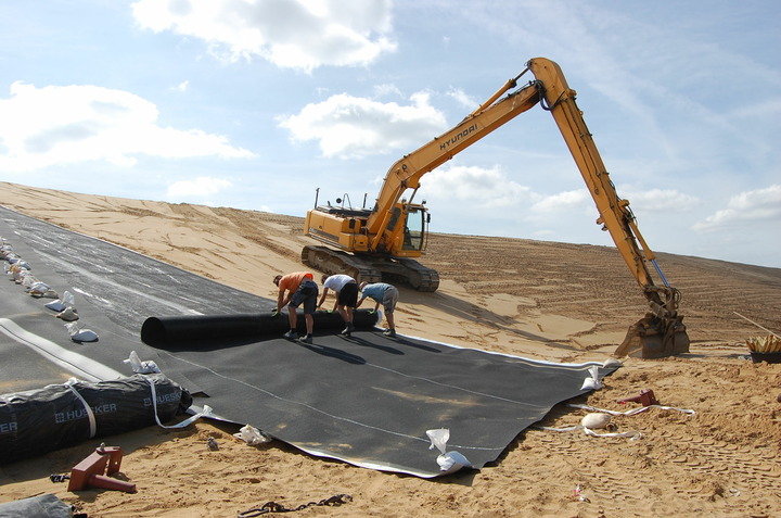 Die Altdeponie wird nun nach und nach von West nach Süd über die Südböschung abgedichtet. „In dieser Woche konnten wir mit dem Einbau der Kombinationsdichtung aus einer Bentonitmatte und einer zweieinhalb Millimeter starken Kunststoffdichtungsbahn beginnen“, so Löffler. Das Verlegen dieser Kunststoffdichtungsbahnen ist gerade bei den derzeitigen Wetterverhältnissen harte Arbeit. Über den schwarzen Bahnen herrschen bei den aktuellen Temperaturen noch in einem Meter Höhe rund 75 Grad.