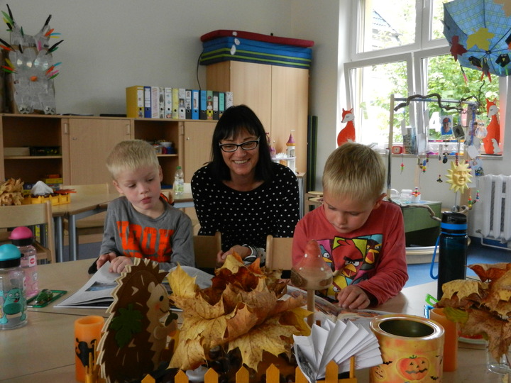 Nicole Tiebel hat den mehr als 50 Quadratmeter großen Gruppenraum herbstlich dekoriert. Dieser bietet 18 Kindern genug Platz zum Spielen, Basteln und Üben. Schritt für Schritt werden sie auf die Schule vorbereitet. Sie lernen schon so manches: kurze Gedichte, ihre Bilder selbst abzuheften und ihre Stifte zu spitzen. Jedes Kind hat ein Fach für seine Federtasche, Bastelzeug und Ähnliches. Bald soll es eine Eulenwoche geben, in der sich alles um Eulen dreht. Auch eine Brandschutzwoche mit Feuerwehrfrau Carmen Zwirz ist geplant. Mittagessen gibt es in einem abgetrennten Bereich der Schulmensa. Auf dem Schulhof mit großem Klettergerüst und Trampolin ist genug Platz zum Spielen. „Im kommenden Jahr soll vor dem Haus 3 ein kleiner Spielplatz für die Vorschulkinder angelegt werden. Die Planungen dazu laufen schon“, erzählt Hortleiterin Silvia Freihof. Im Übrigen kämen die Schul- und Vorschulkinder gut miteinander klar. „Berührungsängste gibt es da nicht. Bei Spaziergängen oder auf dem Bolzplatz kümmern sich die Großen um die Kleinen.“ Auch im Früh- und Späthort sind die Kinder zusammen.