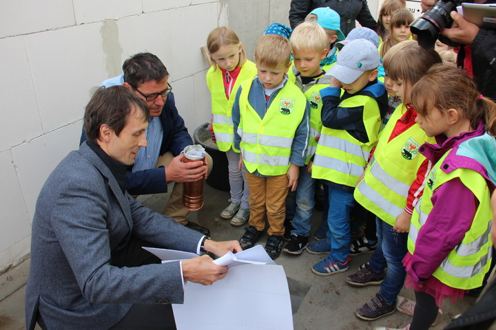 Interessierte Blicke beim fertigmachen der so genannten "Zeithülse" für den Grundstein der neuen Kita "An der Viehtrift" (Foto: Pressestelle)