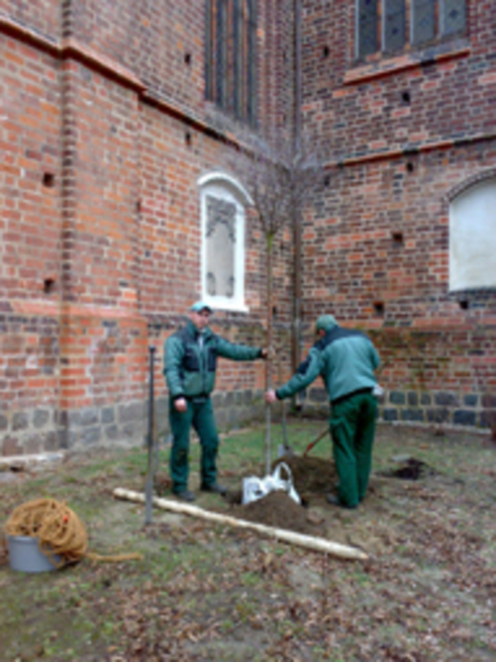 Zwei Kugel-Kirschen wurden gestern von Mitarbeitern der Firma Hoppes Gartenpflege im Auftrag der Stadt neben der Bernauer St.-Marien-Kirche gepflanzt. "Auf der durch die Sanierung der Kirche in Mitleidenschaft gezogenen Grünfläche soll später eine Bank aufgestellt werden", informiert Dunja Marx vom Bernauer Bauamt. Foto: Stadt Bernau bei Berlin