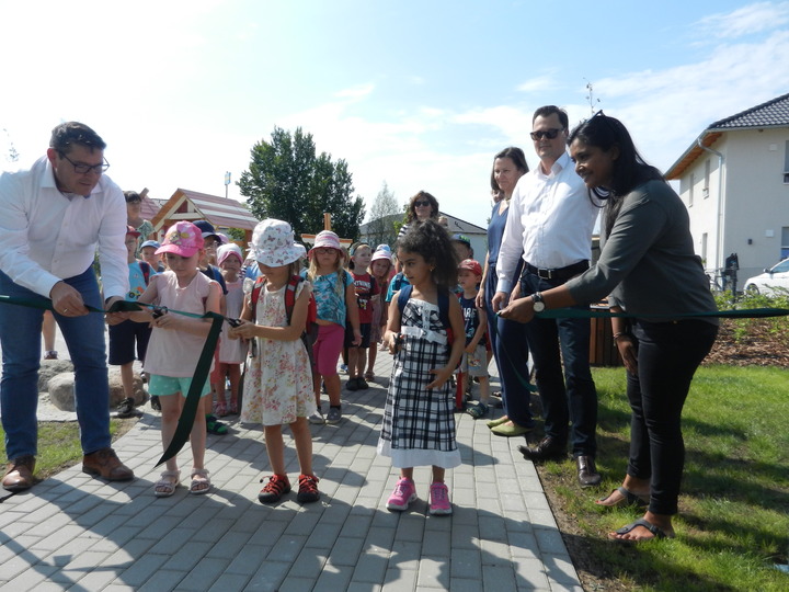 Ein neuer Spielplatz wurde heute am Nuthering in Bernau-Friedenstal freigegeben. Gebaut wurde er im Auftrag der Bonava Deutschland GmbH, die das neue Wohngebiet „Friedenstaler Gärten“ errichtet. Lars Lieske, stellvertretender Regionalleiter von Bonava und Projektleiterin Zannatun Uddin übergaben den Spielplatz an Bürgermeister André Stahl und damit in städtische Hand. „Da viele junge Familien mit Kindern hierher gezogen sind, wird der attraktive Spielplatz auch wirklich gebraucht“, so das Stadtoberhaupt. Kinder aus der Kita „Friedenstaler Spatzen“ testeten die Spielgeräte gleich ausgiebig und voller Freude.