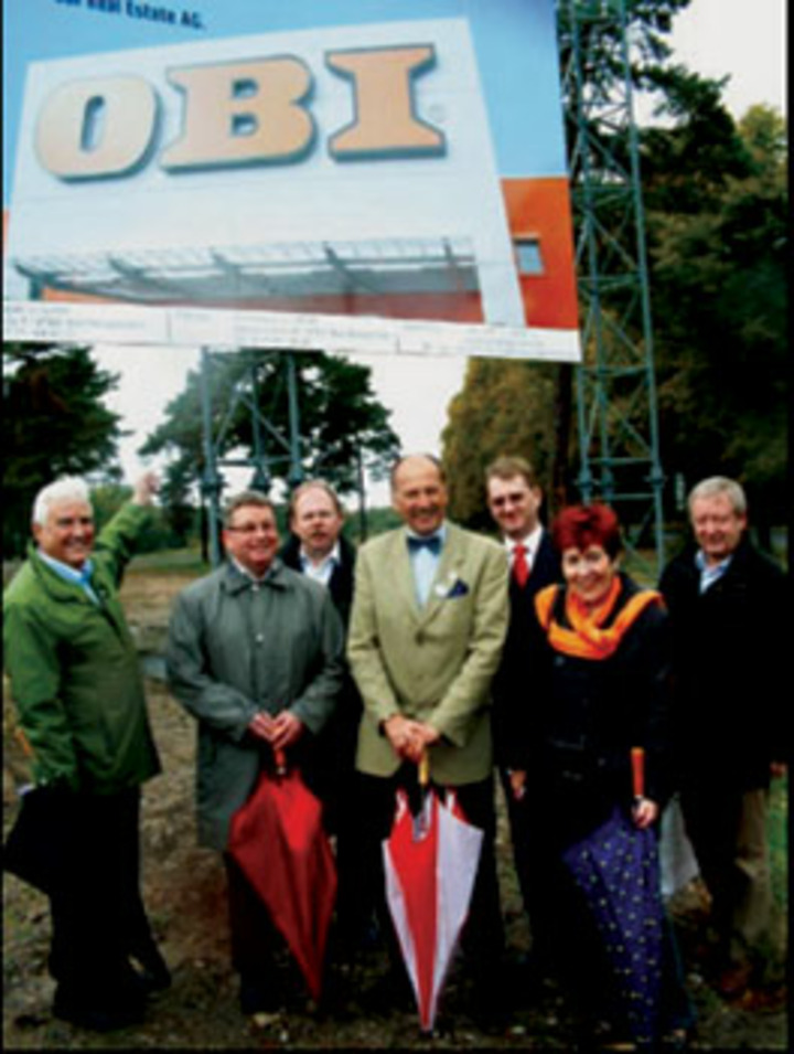 „Sobald die Baugenehmigung vorliegt, was voraussichtlich am 5. Oktober sein wird, legen wir los“, verspricht Klaus Ziegler von S & Z INVEST, dem Errichter des neuen OBI-Baumarktes bei der offiziellen Grundstücksübergabe auf dem Gewerbegebiet Rehberge. Dort deutet seit heute ein weithin sichtbares Bauschild auf die bevorstehende Baumaßnahme. „Genauso wird dann der Eingangsbereich des neuen Baumarktes auch aussehen. Laut Vertrag soll das Gebäude bis zum 30. Juni nächsten Jahres fertiggestellt sein. In der Regel erfolgt die Eröffnung etwa sechs Wochen danach“, erläutert Ziegler, der bundesweit schon eine ganze Reihe von Großprojekten realisiert hat. Er habe die Erfahrung gemacht, dass eine solche Ansiedlung gleichzeitig eine Initialzündung für die weitere Entwicklung des Gewerbegebietes darstellt. Dies sei erst kürzlich gerade wieder im Zusammenhang mit der Eröffnung des Baumarktes in Buchen, einer mit Bernau durchaus vergleichbaren Stadt im Odenwald, deutlich geworden. Dort sei es auch gelungen, Kaufkraft in die Stadt zu ziehen und eine gute Zusammenarbeit mit den Innenstadtgeschäften zu entwickeln. Beispielsweise habe man am dortigen OBI-Standort Werbeschilder für die Innenstadt aufgestellt. So etwas sei auch in Bernau denkbar. Er sei sich sicher, dass auch für Bernau viele positive Impulse zu erwarten sind. „Wir sind überzeugt von dem Standort“, bestätigt auch Karsten Schulz, Regionaler Expansionsleiter von OBI. Besonders die optimale Verkehrslage sei ein großer Standortvorteil.