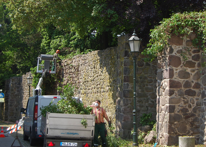 Daher wird jetzt saniert. Heute hat die Firma Ferdinands L-P-G aus Beiersdorf-Freudenberg damit begonnen, das Efeu auf der Stadtmauer zwischen Pulverturm und Henkerhaus zurückzuschneiden. Um sicherzustellen, dass weder Vogelnester mit Nachwuchs noch andere Kleintiere der elektrischen Heckenschere zum Opfer fallen, hat die Untere Naturschutzbehörde des Landkreises den Bewuchs zuvor begutachtet.