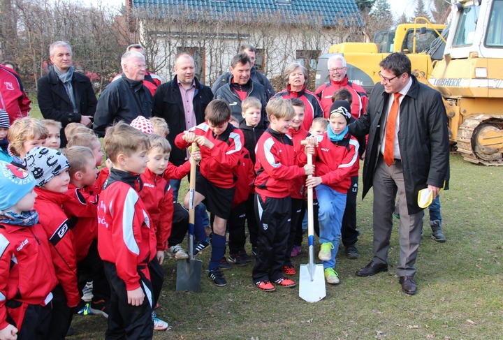 Mit einem Spatenstich begann am Montag der Bau eines Kunstrasenplatzes in Schönow. Zahlreiche Schönower und Vertreter des BSV Rot-Weiß waren dabei, als die Fußballjunioren des Sportvereins zusammen mit Arbeitern der Baufirma die Grasnarbe des alten Platzes öffneten.