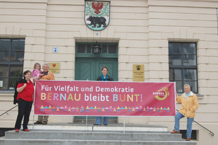 Auch die Stadtverordnetenversammlung hat sich einstimmig gegen rechtsradikale Gruppierungen positioniert und dieses Transparent erstellen lassen, das hier von der Vorsitzenden, deren Stellvertretern und der Geschäftsführerin der Stadtmarketinggesellschaft präsentiert wird.