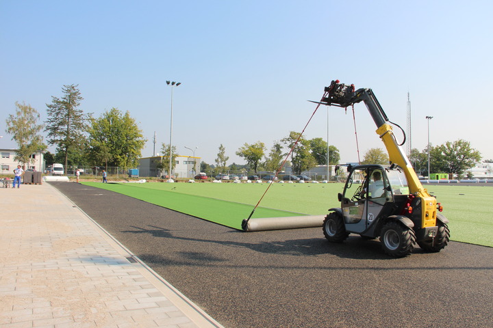 Trotz hochsommerlicher Temperaturen leuchtet auf dem Sportplatz in Rehberge sattes Grün. Grund dafür ist der Kunstrasen, der in dieser Woche gelegt wird.