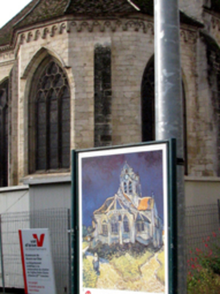Die Kirche von Auvers sur Oise, davor das entsprechende Gemälde von van Gogh