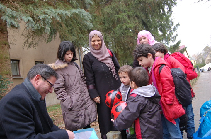 Bürgermeister André Stahl sah das natürlich gern. Herzlich begrüßte er die Männer, Frauen und Kinder im Flüchtlingsheim Lanker Straße 26. „Wir werden versuchen Ihnen bei der Integration zu helfen, damit sie Ihren Weg in unserer Gesellschaft finden.“ Mit Hilfe eines Übersetzers und teilweise in Englisch kamen dann die Flüchtlinge mit ihm ins Gespräch. Gern würden die Männer einmal auf einem richtigen Fußballplatz gegen eine einheimische Mannschaft spielen. André Stahl zeigte sich optimistisch, dass das klappen könnte. Gewünscht wird auch eine bessere Internetanbindung, um den Kontakt zu in der Heimat verbliebenen Familienmitgliedern halten zu können. Auch dafür will sich der Bürgermeister einsetzen. Er war noch dabei, auf Fragen zu antworten als ein Auto vorfuhr, aus dem neu ankommende Flüchtlinge stiegen: eine syrische Familie mit sieben Kindern. Mit Staune-Augen und auch etwas ängstlich betrachteten die Mädchen und Jungen ihr neues Zuhause. Ein kleines Lächeln huschte dann aber doch über ihre Gesichter, als sie zur Begrüßung Bälle bekamen.