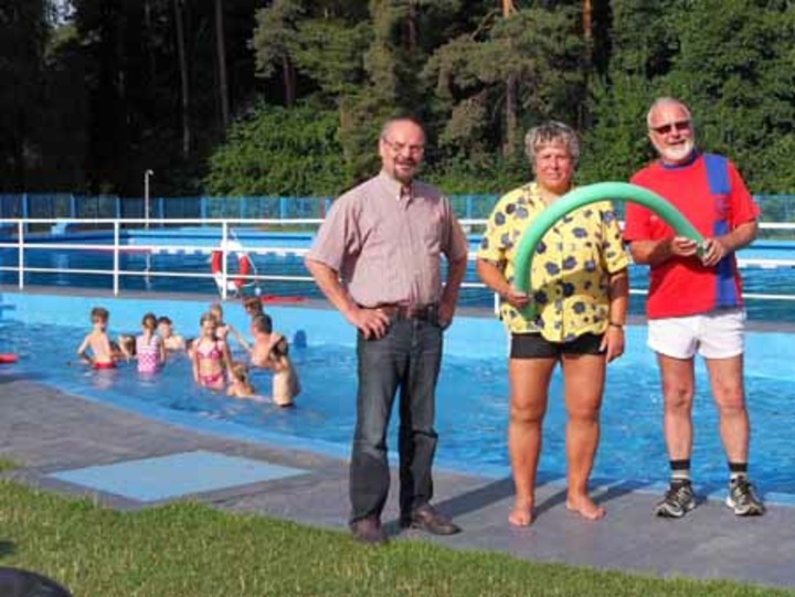 Bei 33 Grad Celsius Luft- und 25 Grad Wassertemperatur begannen gestern in Bernau die Schwimmkurse für Vorschulkinder. 160 Mädchen und Jungen aus elf Bernauer Kindertagesstätten lernen während der Sommerferien unter Anleitung von Schwimmlehrern im Freibad Waldfrieden schwimmen. Die Teilnahme an einem zweiwöchigen Kurs kostet 40 Euro. Am Kursende können die Kinder die Prüfung für das Schwimmabzeichen „Seepferdchen“ ablegen. Um es zu bekommen, müssen sie 25 Meter ohne Hilfe schwimmen, ins tiefe Wasser springen und tauchen können. „Am 20. August wird dann Neptunfest gefeiert“, verrät Schwimmmeister Günter Klein schon mal. Aufgrund der Kurse ist das Freibad bis 20. August montags bis freitags erst ab 13 Uhr für die anderen Besucher offen. Bis 19 Uhr können diese sich dann im kühlen Nass erfrischen. Am Wochenende ist das Bad von 10 bis 19 Uhr geöffnet. Angeboten werden die vom DRK durchgeführten und von der Stadt Bernau finanziell unterstützten zweiwöchigen Kurse seit 2006.Lust auf das kühle Nass hat auch Bernaus stellvertretender Bürgermeister Eckhard Illge, der die Kurse zusammen mit Schwimmmeister Günter Klein (links) eröffnete