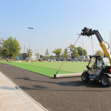Trotz hochsommerlicher Temperaturen leuchtet auf dem Sportplatz in Rehberge sattes Grün. Grund dafür ist der Kunstrasen, der in dieser Woche gelegt wird. mehr erfahren
