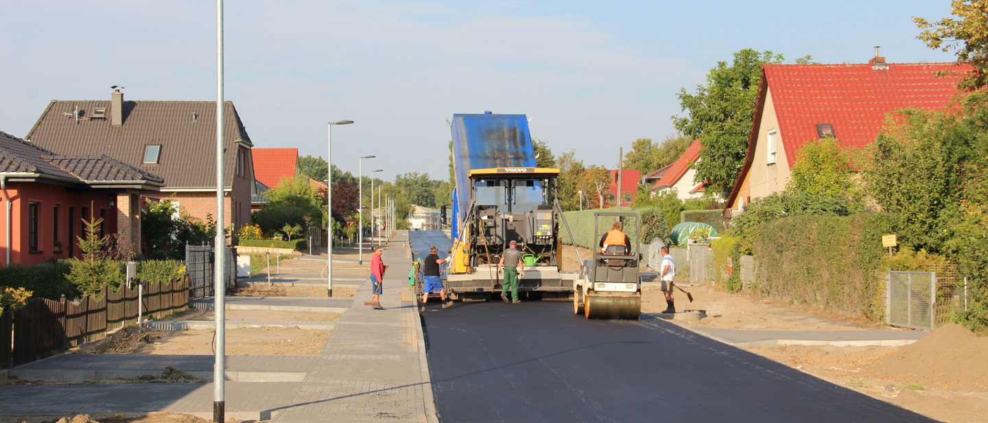 Bei 27°Celsius braucht man normalerweise keine Decke. Die Siedlungsstraße „Im Finkenschlag“ bekam heute Vormittag trotzdem eine – vier Zentimeter dick und aus Asphalt. Bei bestem Wetter konnte heute die Deckschicht aufgebracht werden. Wenn die letzten Restarbeiten erledigt sind, kann die Straße in Ladeburg für den Verkehr freigegeben werden. Ende September soll es soweit sein.