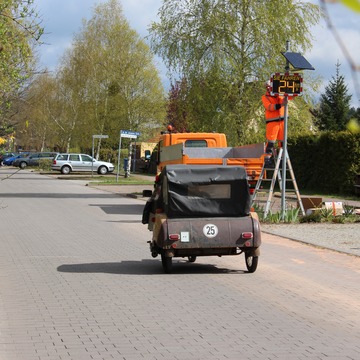 Seit heute Vormittag zeigt ein Messgerät am Eingang des Ortsteils Lobetal an, ob die Verkehrsteilnehmer den verkehrsberuhigten Bereich (Höchstgeschwindigkeit: 10 km/h) achten. Zur Belohnung erscheint auf der Anzeigetafel nach der exakten Geschwindigkeit ein lächelndes Gesicht. Der rund 2.800 Euro teure Geschwindigkeitsmesser wurde von der Stadt auf Anregung des Ortsbeirats beschafft.