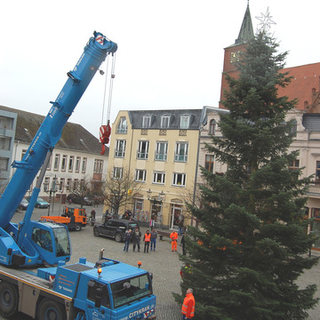 Heute wurde der Weihnachtsbaum auf dem Bernauer Marktplatz aufgestellt. Die etwa 12 Meter hohe und anderthalb Tonnen schwere Colorado-Tanne kommt wie schon der Vorjahresbaum aus dem Garten von Familie Stielow aus Zepernick. „Meine Frau war ganz traurig, dass er gefällt wurde. Schließlich haben wir ihn vor 32 Jahren zusammen gepflanzt“, so Bodo Stielow. Doch die herrliche Tanne sei einfach zu groß geworden für den Garten. mehr erfahren