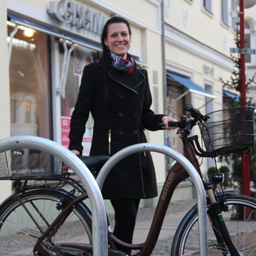 Die gute Stube, also die Innenstadt Bernaus, wird derzeit möbliert: 36 neue Fahrradständer wurden am Montag an mehreren Standorten aufgestellt, in der nächsten Woche werden noch 14 weitere folgen. Die Idee brachten Bernauer in den Bürgerhaushalt 2015 ein; rund 15.000 Euro gibt die Stadt dafür aus. Hobbyradlerin Diana König – hier in der Brauerstraße – freut sich über die stabilen Abstellmöglichkeiten.