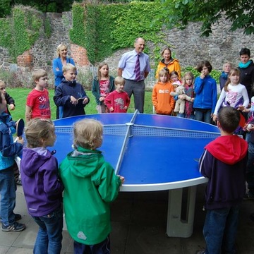 Zusammen mit 30 Bernauer Kindern hat Bürgermeister Hubert Handke am Donnerstag den neu gestalteten Spielplatz „Hohe Steinstraße“ eingeweiht. Mit einer Partie Tischtennis haben die Mädchen und Jungen die Anlage in Besitz genommen.