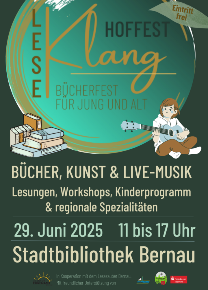 Das LeseKlang-Hoffest ist eine Kooperation der Stadtbibliothek mit dem Lesezauber Bernau. „Es ist ein Tag voller Geschichten und kreativer Aktivitäten. Wir bringen als Bibliothek und Bildungseinrichtung die Autorinnen und Autoren der Region mit ihren Leserinnen und Lesern zusammen. Für uns bietet sich darüber hinaus die Möglichkeit des Netzwerkens mit den Literaturschaffenden und Literaturbegeisterten“, schätzt Bibliotheksleiterin Gabriele Karla den Mehrwert der Veranstaltung ein.