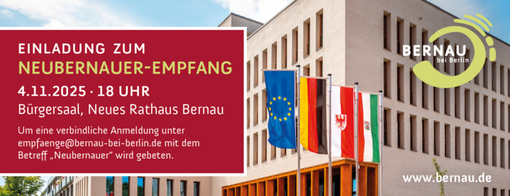 Alle Neubernauerinnen und Neubernauer, die 2025 zugezogen sind, sind zum Empfang eingeladen. Die Stadtverwaltung bittet um verbindliche Rückmeldung bis zu 27. Oktober 2025 unter Angabe der vollständigen Kontaktdaten (Name, Vorname, E-Mail oder Telefon) aller teilnehmenden Personen an die E-Mail empfaenge@bernau-bei-berlin.de mit dem Betreff „Neubernauer". Der Neubernauer-Empfang findet am Dienstag, dem 4. November 2025, um 18 Uhr, im Bürgersaal des Neuen Rathauses, Bürgermeisterstraße 25, statt.