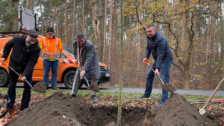 Am Dienstag, dem 25. November, pflanzten Bürgermeister André Stahl und Landrat Daniel Kurth symbolisch einen der insgesamt 94 neuen Alleebäume an der Albertshofer Chaussee. Die Baumpflanzung erfolgt als Ausgleich für das Versiegeln einer Logistikfläche durch die Bernauer Dienstleistungsgesellschaft (BDG).