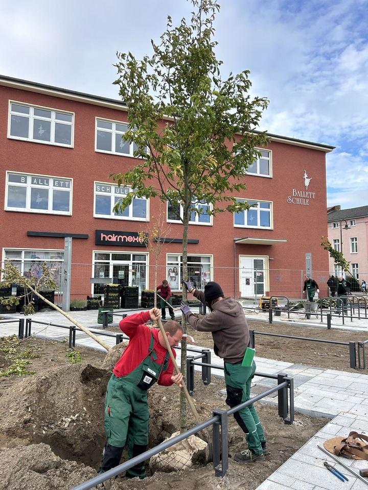 Andererseits werden im zur Breitscheidstraße und der Ladezeile ausgerichteten Bauabschnitt gegenwärtig großkronige Bäume gepflanzt. Silberlinde, Zerreiche, Japanischer Schnurbaum, Baumhasel, Gleditsia, Hopfenbuche und Amberbaum sollen auf dem Bahnhofsvorplatz künftig für eine natürliche Atmosphäre und für schattige Sitzmöglichkeiten sorgen und dem Aufheizen des Platzes entgegenwirken.