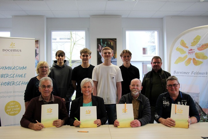 Der Kooperationsvertrag wurde unterzeichnet von Lothar Ast, Mitglied des Vereinsvorstandes des Regionalparks Barnimer Feldmark e. V., Sandra Steinfurt, Direktorin der Docemus Schule, Jürgen Brinckmann, Leiter des Infrastrukturamts der Stadt Bernau, sowie Jörg Dreger, Ortsvorsteher von Blumberg. Ebenfalls anwesend (v. l. n. r.): Birgit Wieske, Paul Kuntzer, Luca Hähnlein, Felix Kraus, Max Teichert und Bernaus Stadtförster Marco Böttcher. (Bild: 1/2)