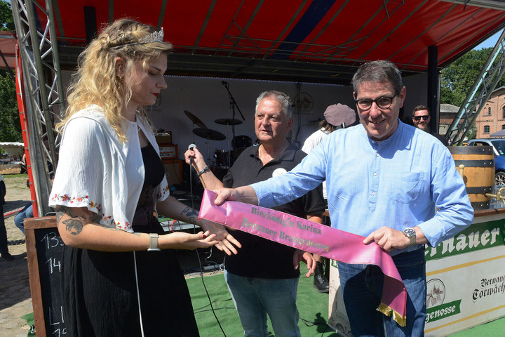 Erstmals wurde nicht nur ein Fass Festbier angestochen, sondern auch die erste Bierkönigin gekrönt. Karina Kurek wird nun als Bierkönigin der Braugenossen festliche Termine begleiten. Gekrönt wurde sie von Bürgermeister André Stahl, der ihr die Krone aufsetzte und auch die Schärpe umlegte.