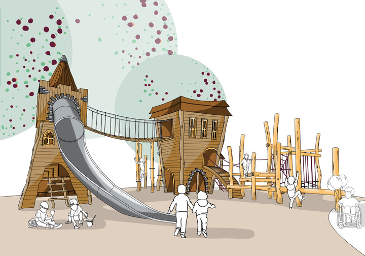 Diese Anlage bringt die Geschichte Bernaus in den Stadtpark und macht sie für Kinder und Familien unmittelbar erlebbar. Zwei Türme, angelehnt an Steintor und Hungerturm, sind offen gestaltet und über Rampen, breite Zugänge und Motorikwände erreichbar, oben verbindet eine sichere Hängebrücke die Baukörper und schafft Aussicht und Spielraum. Rund um den Hungerturm führt ein durchgehender Spielweg mit Balancierelementen, Netzen, Leitern und einer Kurvenrutsche, sodass Bewegung, Mut und Geschick gleichermaßen gefördert werden. Ein separater Bereich für die Kleinsten bietet niedrige Höhenniveaus mit Rutsche, Kletternetz und Steigstamm und ist gut einsehbar für begleitende Erwachsene. Die Anlage ist inklusiv konzipiert und bietet offene Zugänge, gut befahrbare Flächen, unterfahrbare Elemente sowie Handläufe und gut sichtbare Pfosten, damit Kinder mit unterschiedlichen Fähigkeiten gemeinsam spielen können. Die zurückhaltende Farbgebung fügt sich in die historische Kulisse von Bernau ein und lädt zu Rollenspielen rund um Stadtmauer und Tor ein. Familien finden hier eine klare Struktur, gute Übersicht und vielfältige Angebote für verschiedene Altersstufen.