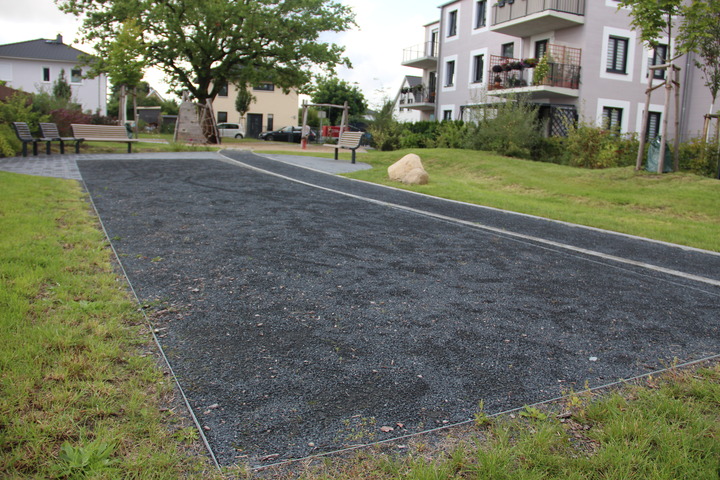 Verschiedene Schichten auf dem 3 x 13 Meter großen Platz sorgen dafür, dass dieser den Einschlag der Eisenkugeln dauerhaft aushält und den Regen rasch versickern lässt. Die Firma Märkisch Grün nahm die fachgerechte Umsetzung der Spielfläche vor – das stadteigene Forstteam stellte Bänke und Tische zum Verweilen auf. Die Idee für den Boule-Platz stammt aus dem Bürgerhaushalt 2020. Die Stadt investierte knapp 10.000 Euro dafür – im Herbst wird die Fläche noch zusätzlich mit besonders insektenfreundlichen Pflanzen bestückt.