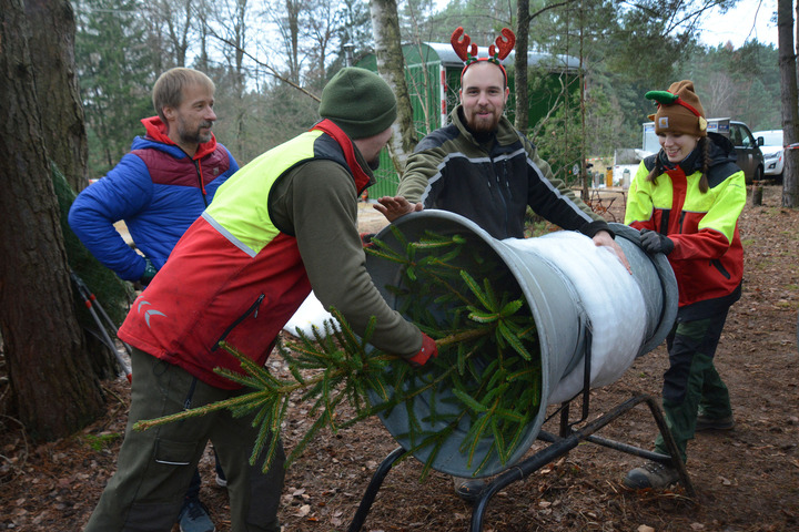 Nach dem Schlagen kommt das Vermessen der Bäume, um den Preis zu ermitteln. Je nach Baumart und Größe liegt der Preis zwischen 5 und 20 Euro. Zu guter Letzt kommen die Bäume für den Transport ins schützende Netz. „Unsere vier Forstauszubildenden haben die Bäume den ganzen Tag beherzt verpackt. Neben der Treibjagd ist das Weihnachtsbaumschlagen ein schönes Event für unsere Nachwuchskräfte", so Böttcher. Alle Gäste konnten sich nach der Arbeit noch an Heißgetränken, Wildfleisch und Suppe vom Gasthaus am Gorinsee stärken.