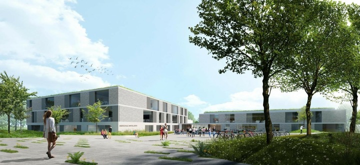 Der Entwurf sieht eine sogenannte Clusterschule mit drei verbundenen Gebäuden vor. Die Häuser verfügen über größere Unterrichtsräume sowie flexible Lehr- und Lernräume, die auf grüne, lichtbringende Atrien im Inneren ausgerichtet sind.