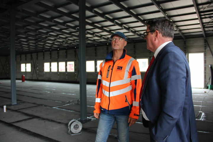 Der Rohbau der neuen Halle für den Tafel e.V. Bernau ist fertig. Bürgermeister André Stahl überzeugte sich am Donnerstagnachmittag, 8. September 2022, an der Oranienburger Straße 46 persönlich vom Stand der Bauarbeiten.
